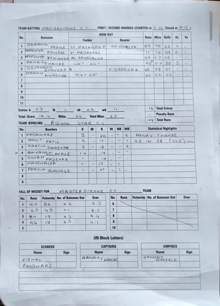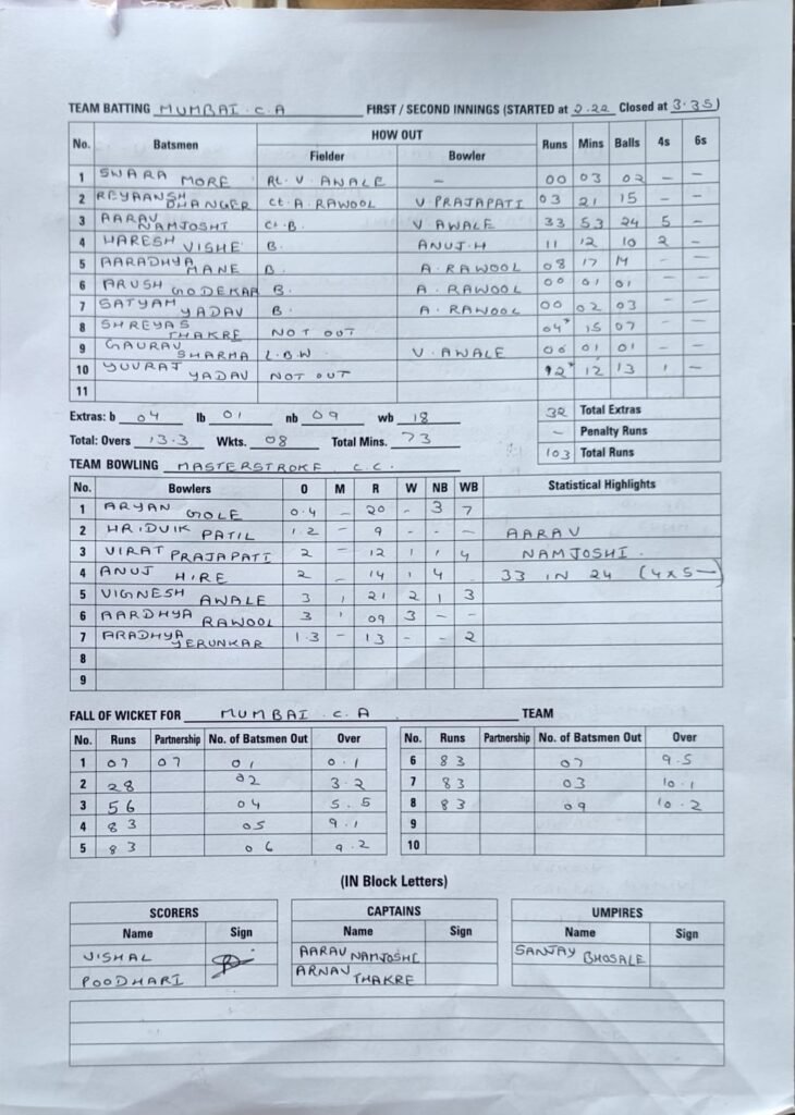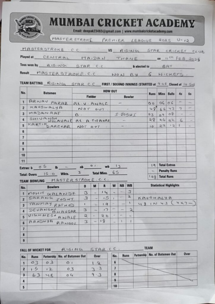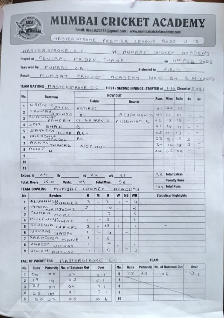 Maaster Stroke Cricket Academy vs Mumbai Cricket Academy