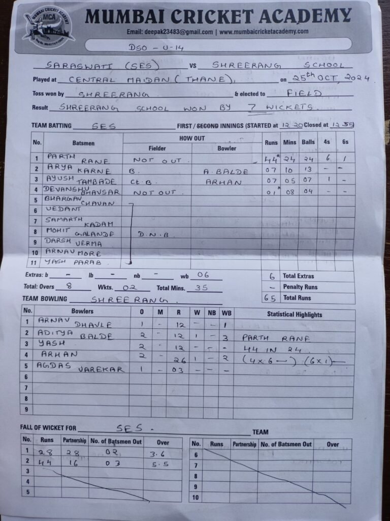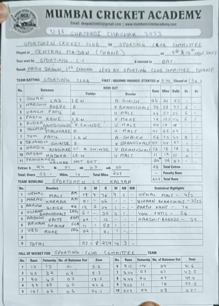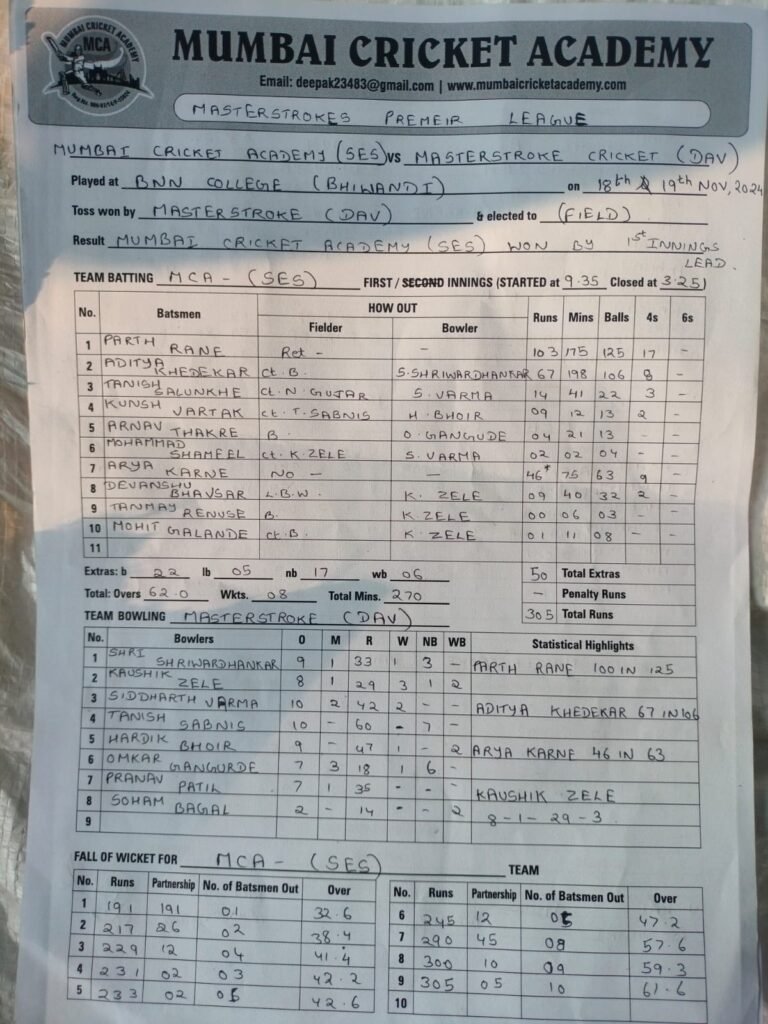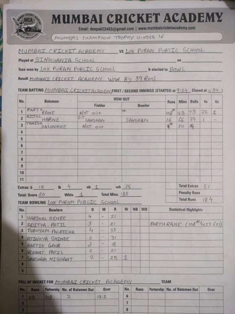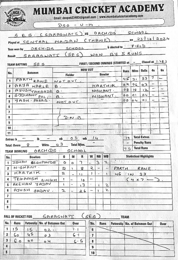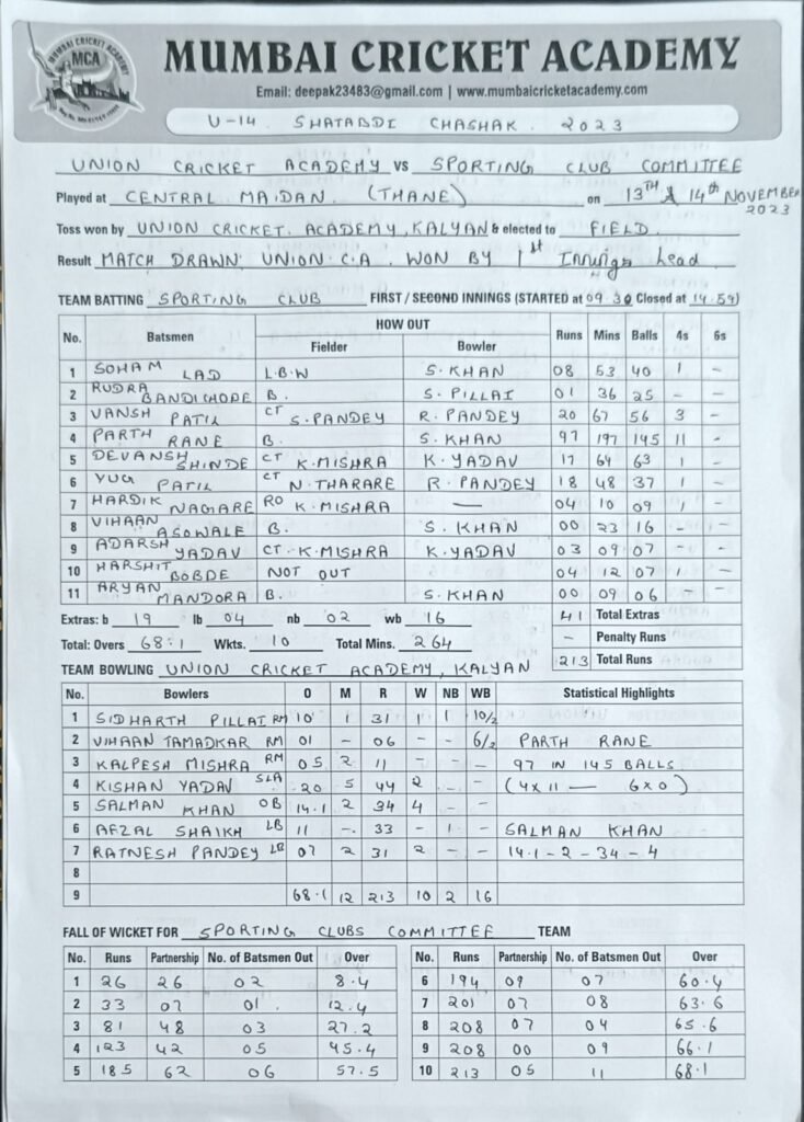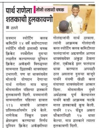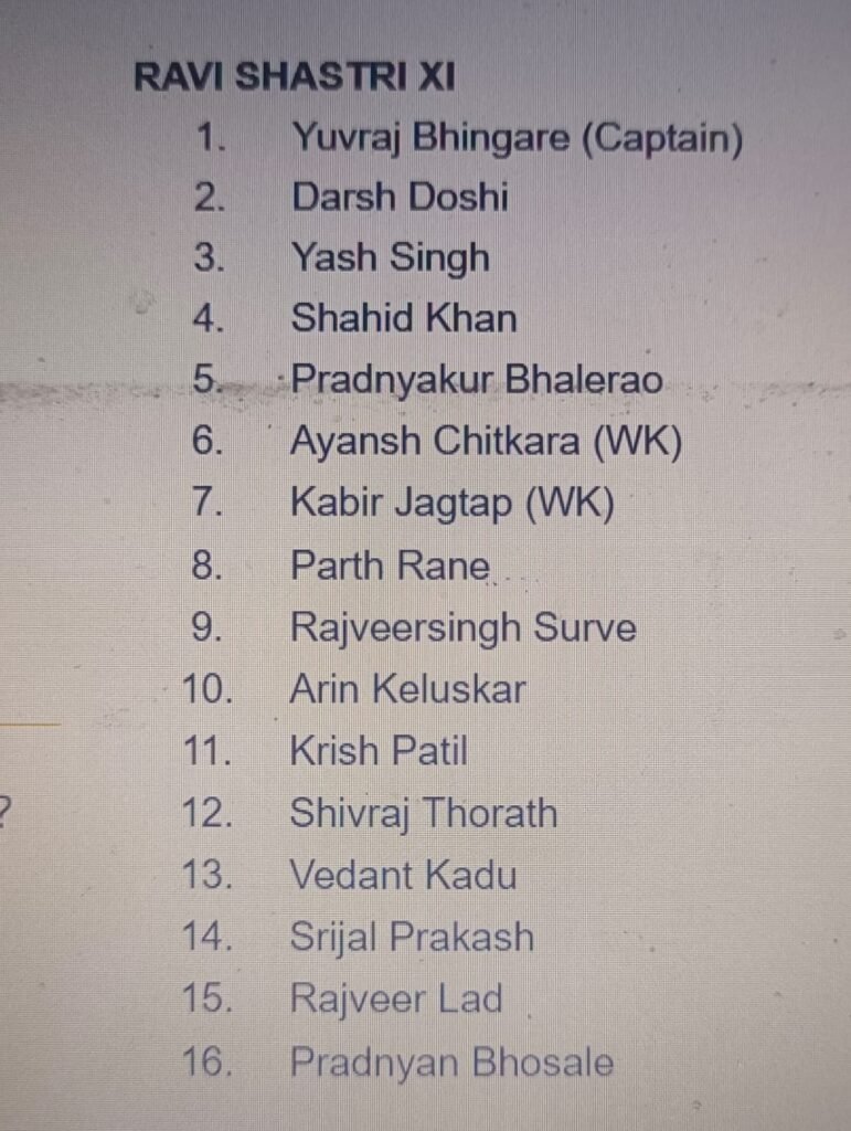 Parth Rane Selected MCA dream 11 cup u-14 Ravi shastri XI team |